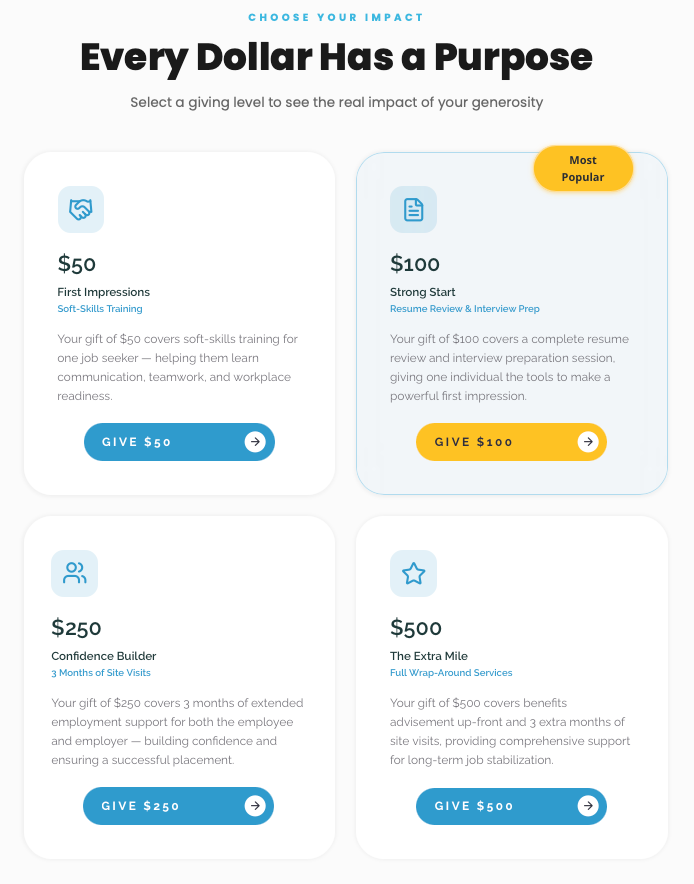 When people give, volunteer, or support our mission in other ways, they help us continue showing up for individuals and families with the guidance, services, and encouragement that meaningful employment often requires.